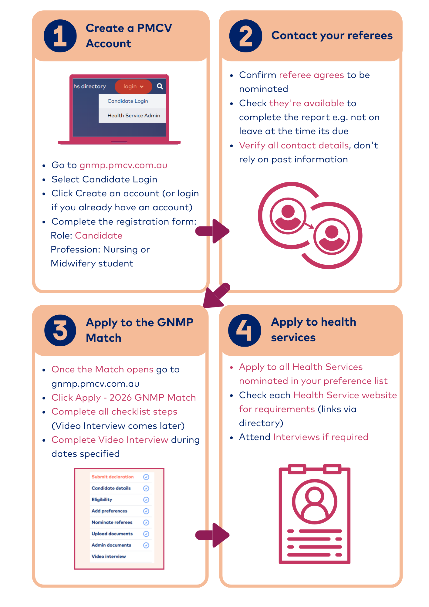 - Check the Health Service website to ensure you understand their individual application requirements.